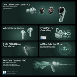 OnePlus Buds 4 TWS Earbuds with Upto 55dB Real-time ANC,Adaptive Mode,Dual Drivers with Dual DACs,3D Audio,Upto 45hrs Music Playback,Dual-Device connectivity,47ms Low Latency[Zen Green]