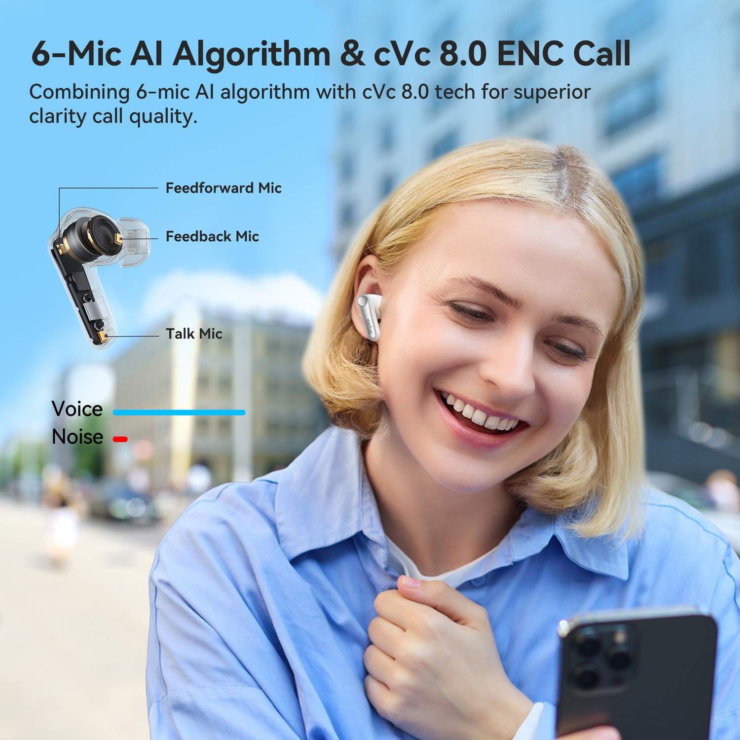 • 🎧 Support for LDAC, LE Audio, and LC3 codecs ensures compatibility with high-fidelity sources. AI Algorithm and 6 Mics ENC. Enhanced by 6 built-in microphones, advanced AI algorithms, and Qualcomm cVc 8.0 tech, the wireless earbuds with active noise cancellation effectively eliminate background noise to improve vocal clarity during calls. Enjoy crystal -clear calls regardless of your surroundings.