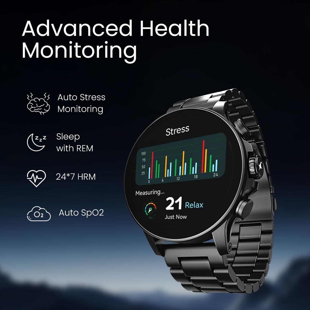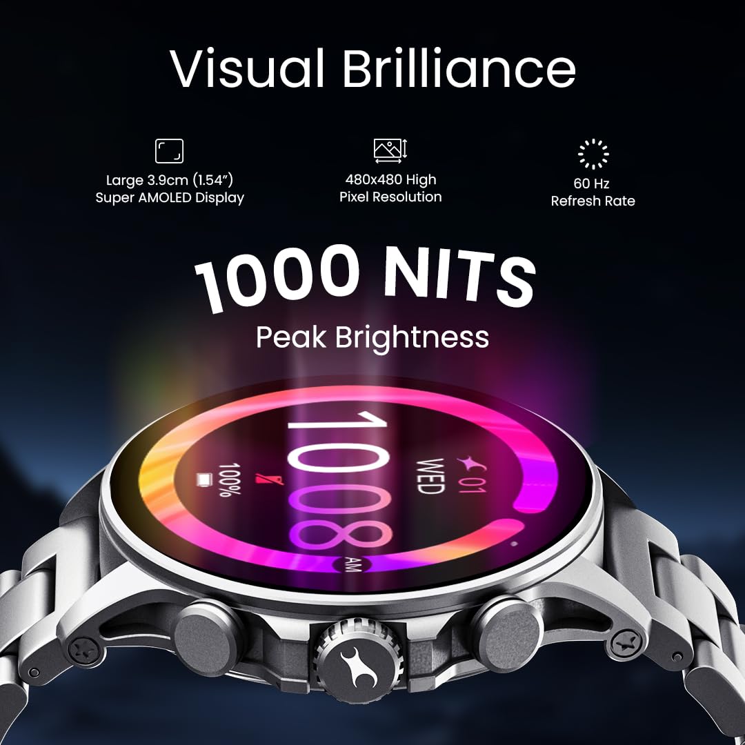 • 1.54” Super AMOLED Display – Experience crisp 480×480 resolution, 1000 nits brightness & 60Hz refresh rate for stunning clarity. A smart watch for man & woman that combines vibrant visuals with a premium touch.