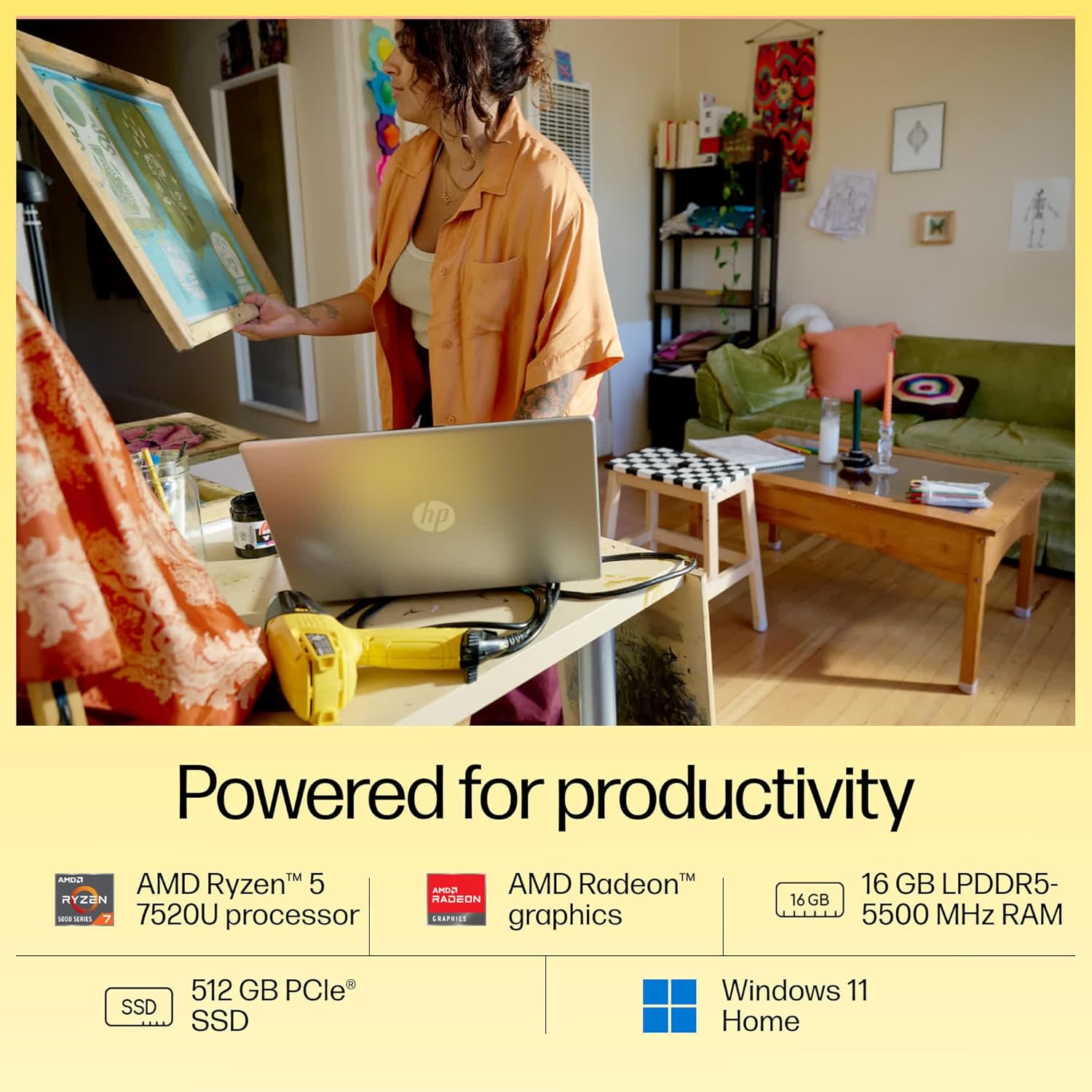 HP 15, AMD Ryzen 5 7520U, 16GB DDR5, 512GB SSD, (Win 11, Office 21, Silver, 1.59kg), Anti-Glare, Micro-Edge, 15.6-inch(39.6cm), FHD Laptop, AMD Radeon Graphics, 1080p FHD Camera, Backlit KB, fc0156AU