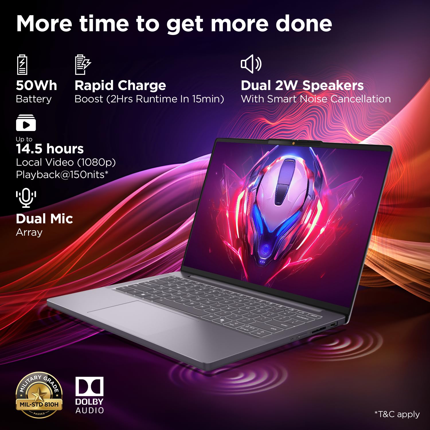 • Camera:- FHD 1080p with Privacy Shutter | Audio:- Stereo speakers, 2W x2, optimized with Dolby Audio