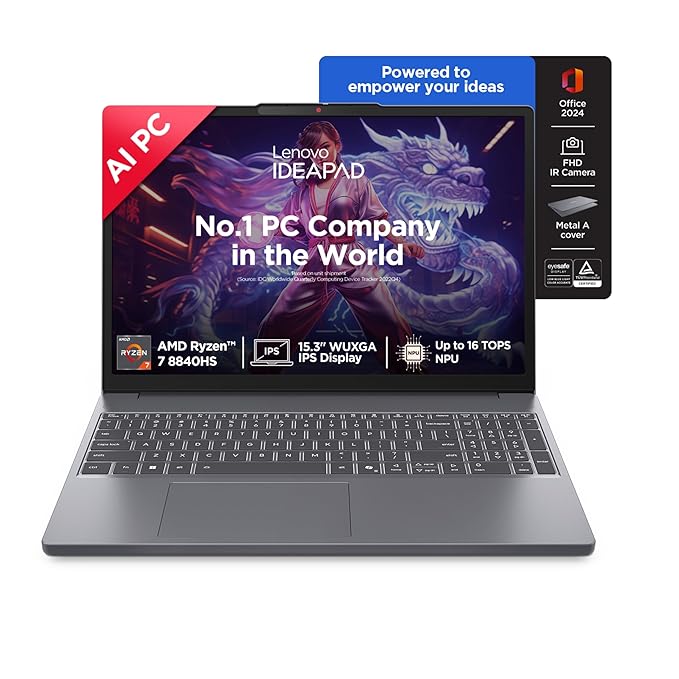 Lenovo IdeaPad Slim 3 AMD Ryzen 7 8840HS 15.3 inch (38.8cm) WUXGA IPS AI PC Laptop(24GB RAM/1TB SSD/Windows 11/Office Home 2024/Backlit Keyboard/1Yr ADP Free/Grey/1.6Kg), 83KA004TIN