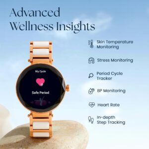• Designed for Modern Women – Track women’s health, skin temperature, heart rate, SpO2, BP, stress, sleep with REM, hydration alerts & breathing rate—smartwatch for women that supports all-day wellness and well-being.