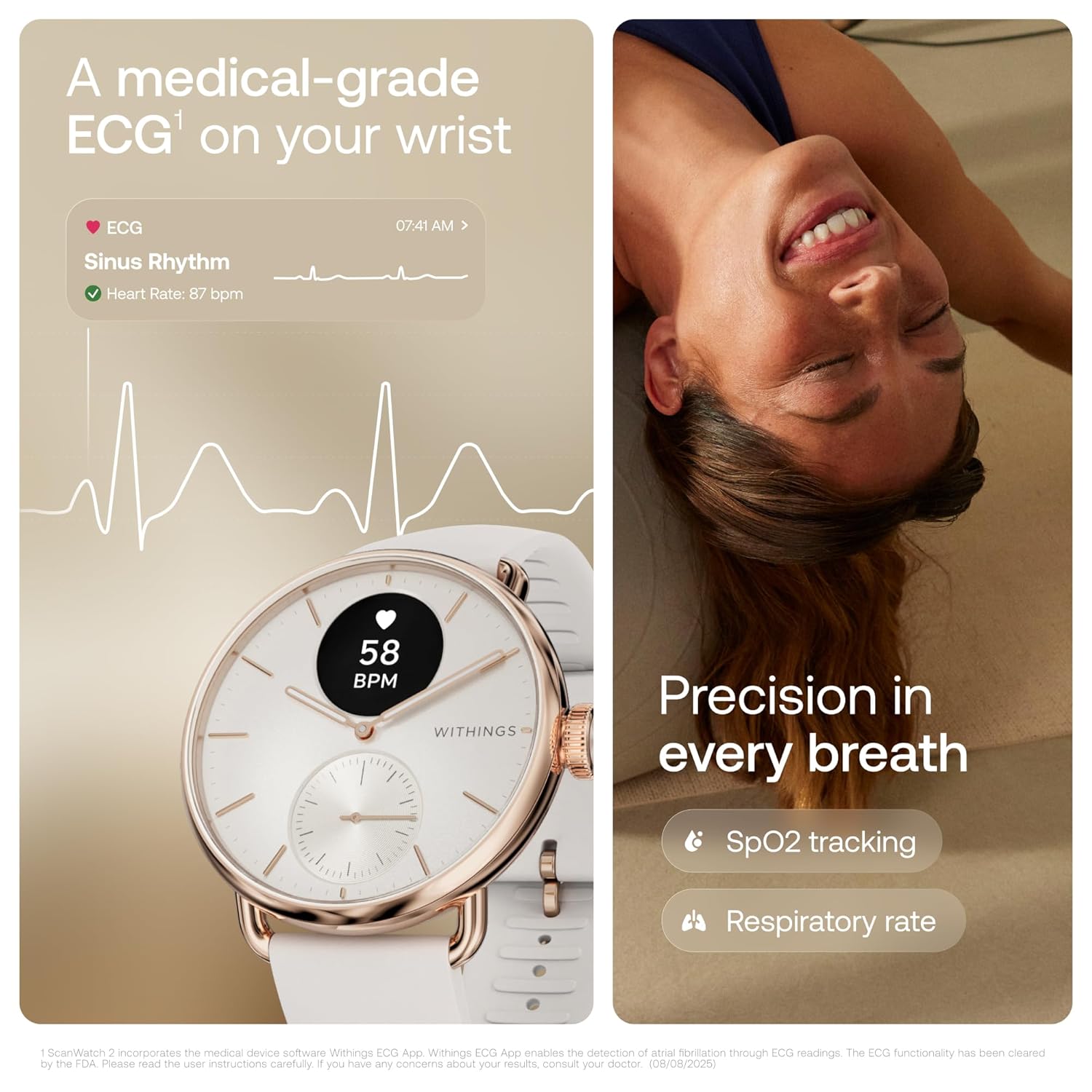 Withings ScanWatch 2, Heart Health Hybrid Smartwatch for Men & Women – ECG, with SPO2, Temperature Monitoring, Sleep, Respiratory Health, Cycle Monitoring, 30-Day Battery Life, iOS & Android – 38mm
